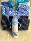 Carry all of baby's essential items with you. Roomy and comfortable. Including 3 baby items of choice (like onesie, bottle, sippy cup) (Optional included personalized stuffed animal.). Call for details.