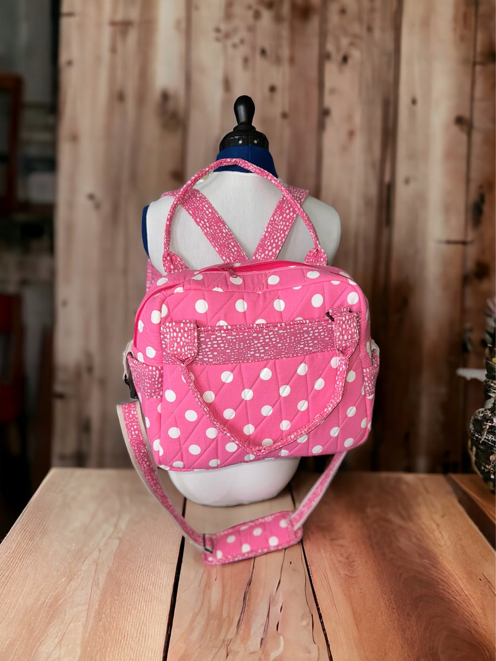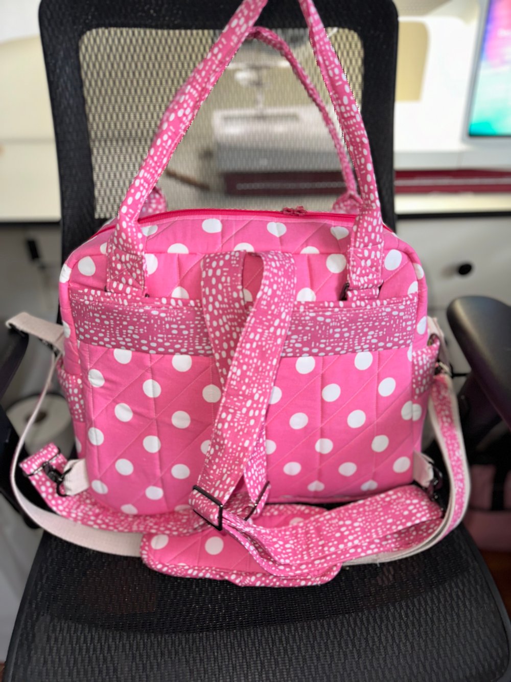Handmade quality diaper bag. Can be carried over the shoulder, as a backpack, over the stroller or and as a handbag. Inner pockets, zippers and bottle holders make carrying all of baby's most important items as easy as can be. Contact us prior to finalizing your order for any add-ons.